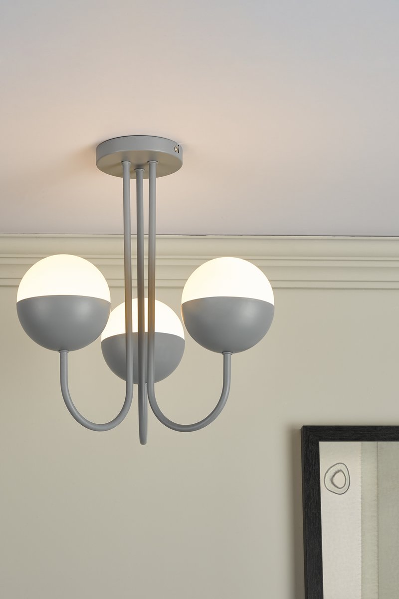 The Andre three light semi flush pendant is an ultra-contemporary fitting, with opal white glass uppers, designed to diffuse light, above powder-coated matt grey lower halves. Semi flush fittings are popular as they sit closer to the ceiling than a pendant so are suitable for lower ceilings and smaller rooms.
