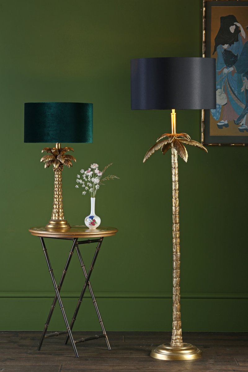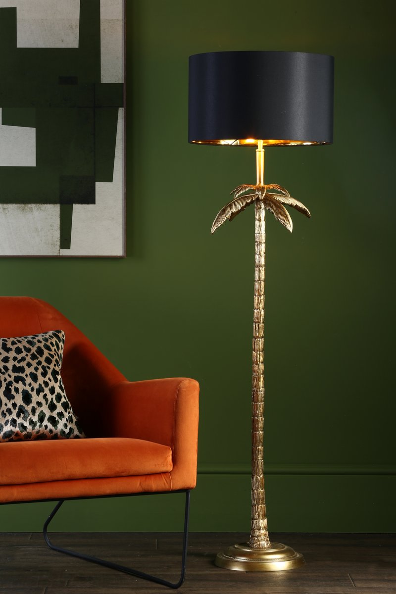 A very detailed model of a palm tree makes this floor lamp a quirky addition to your room, a statement on its own or combine it with jungle print fabrics and wall paper for a full tropical theme. The gold leaf finish adds an element of opulence, topped off with a black cotton drum shade.
